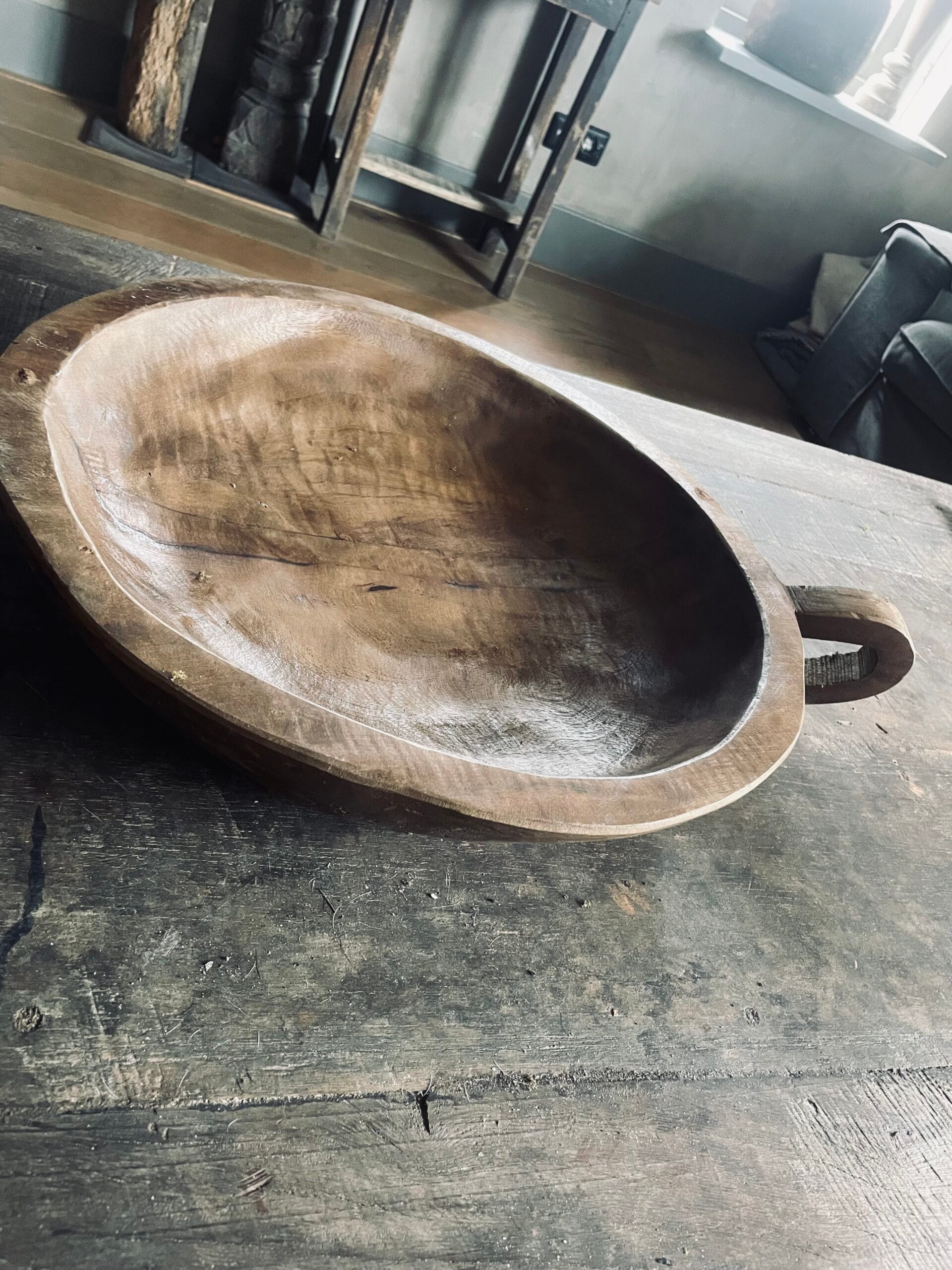 Stoere houten schaal met handvat